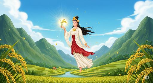 Truyện kể về một vị nữ thần xinh đẹp nhưng tính khí hay hờn dỗi, được Ngọc Hoàng phái xuống trần để nuôi sống con người sau nạn lụt kinh hoàng. Khi lòng người không còn biết trân trọng ơn trên, nữ thần đã giận dữ và khiến lúa không còn tự về nhà hay tự biến thành cơm nữa. Từ đó sinh ra các tập tục như cúng hồn lúa, cơm mới, và những ngày hội rước bông lúa đầy màu sắc khắp các vùng quê Việt Nam.